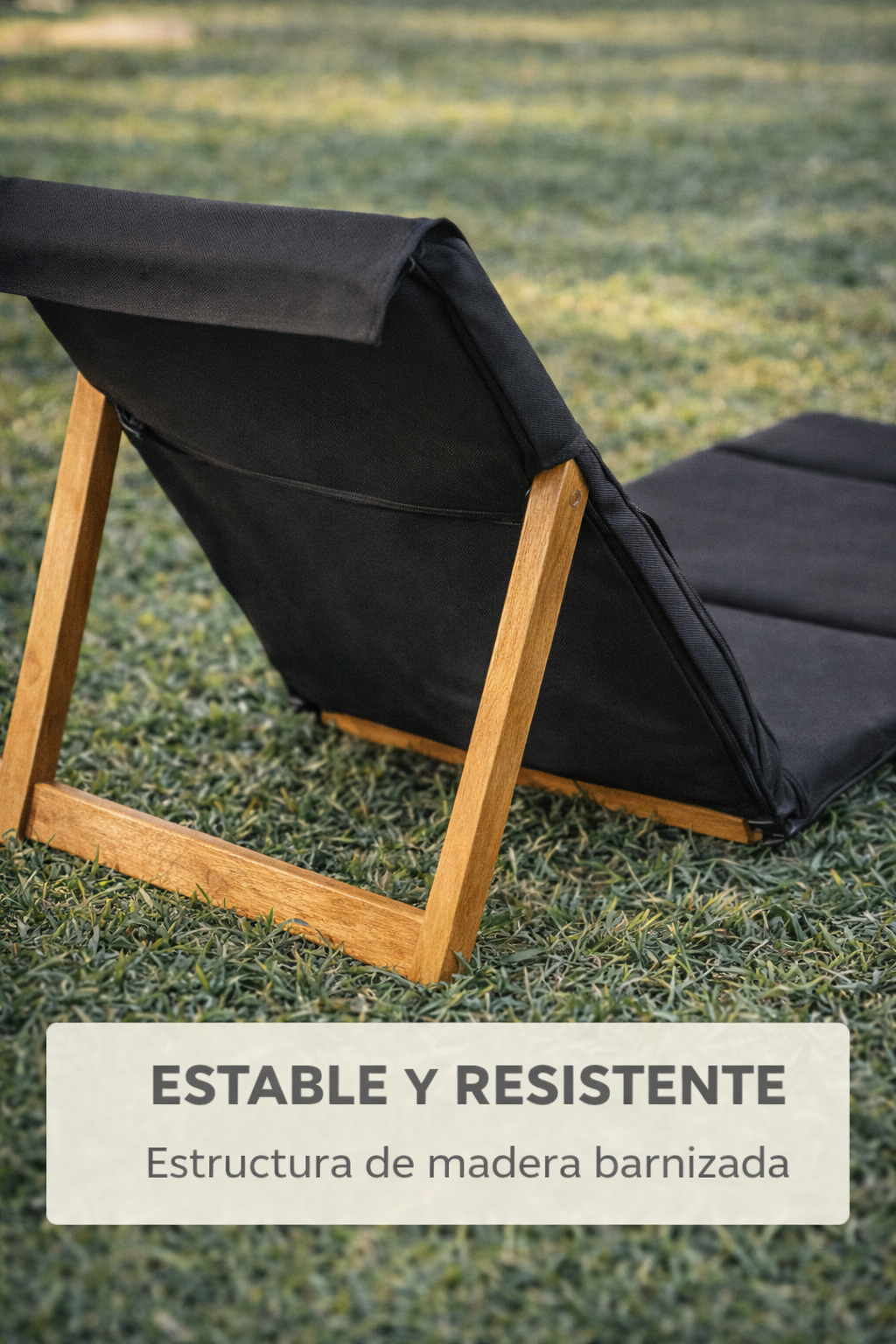 Su diseño liviano y compacto permite llevarlo colgado o guardarlo sin ocupar espacio. Al desplegarlo, ofrece un respaldo firme con estructura de madera barnizada que aporta estabilidad y durabilidad, incluso sobre césped o superficies irregulares.